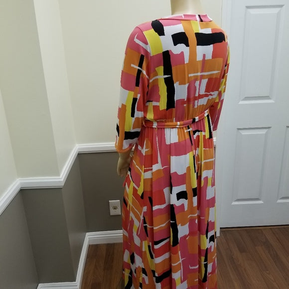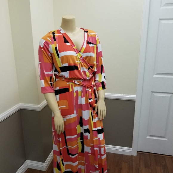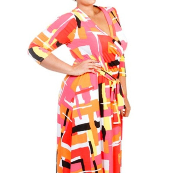 Expertly crafted and stylish, Abstract Chic in Pink is a maxi dress featuring elastic waistband for comfort, a self tie belt for added flair, a V-neckline for a touch of sophistication, and 3/4 length sleeves. This figure-flattering piece is a must-have for any fashion-forward wardrobe, making it a versatile and timeless choice.