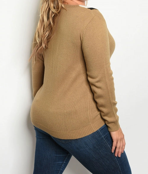 Stylish V- neck long sleeve Sweater in Mocha with Cream and Black trim
