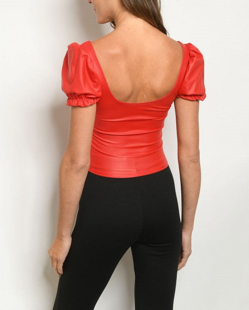 Beautiful Tomato Red short puff sleeve square neck faux leather fitted top