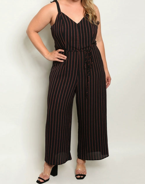Beautiful "Angela" Jumpsuit in black, red strips, Tie sash, V-back with tie closure, wide leg
