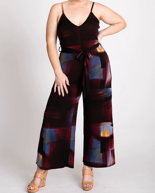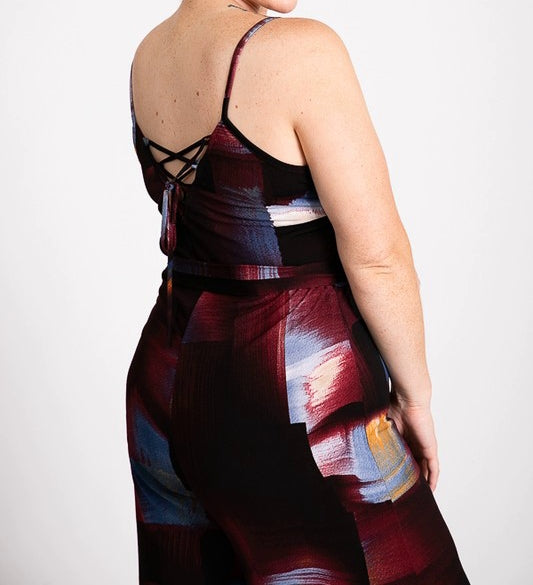 Beautiful Burgundy jumpsuit with multi color hues, wide leg, tie sash and spaghetti strap. Rear has laced-up tie closure