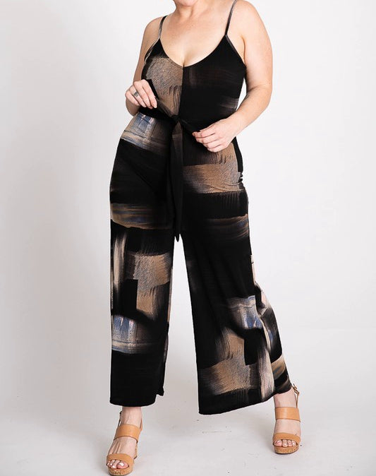 Beautiful Taupe jumpsuit with multi color hues, wide leg, tie sash and spaghetti strap. Rear has laced-up tie closure
