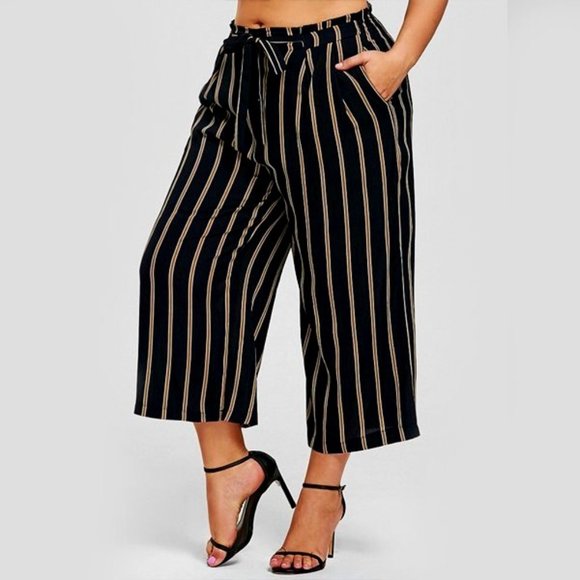 Wide leg culottes. Deep Blue with gold and white strips, tie belt with inset pocket on each side.