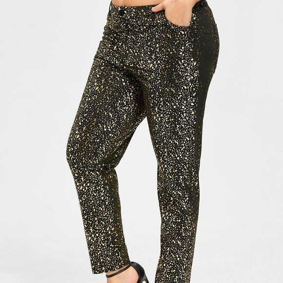 Sexy Black pant with Bronzed embellishments. 2 front pockets and 2 hip pockets. Straight leg ankle length and zipper in front.