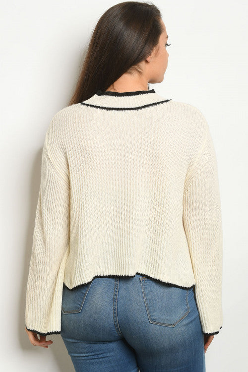 Cute long flare sleeve closed neck knitted top with contrast trim edge detail.