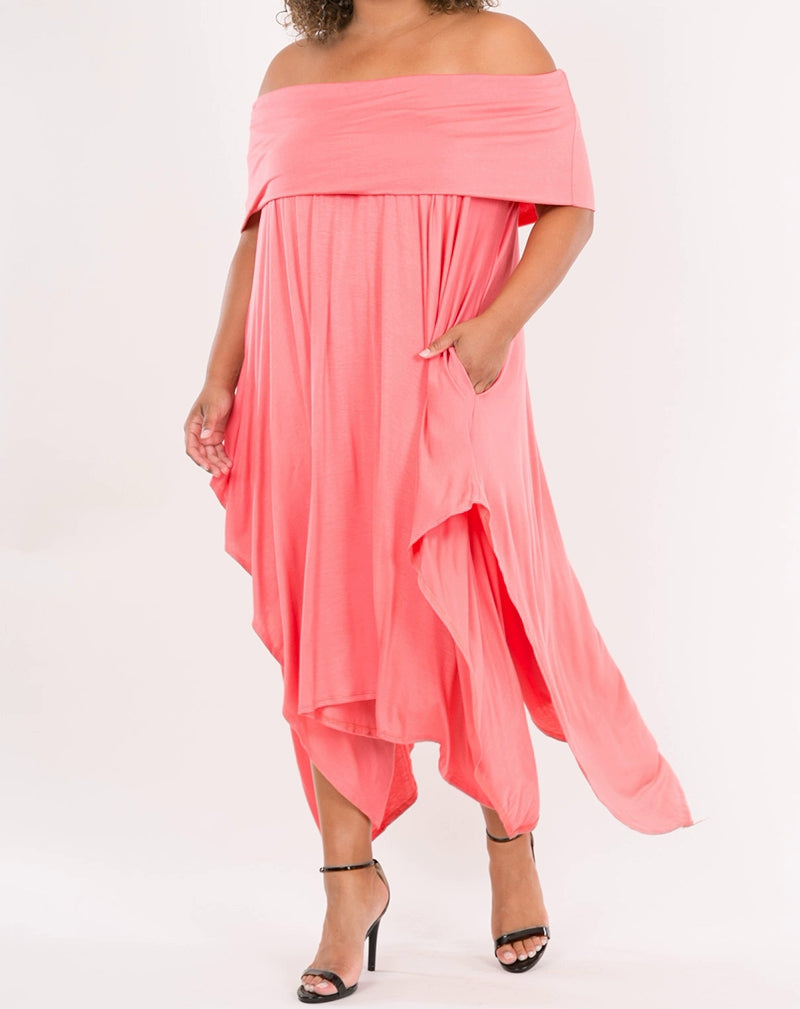 Coral color Off the Shoulder Handkerchief dress with in seam side pockets and loose comfort fit cut. Dress is sleeveless and has a stretch Bandeau neckline.