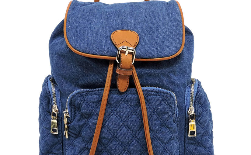 Quilted Denim Drawstring Backpack with 2 side 1 front and 1 rear pocket with zipper closure. Magnetic closure for main section