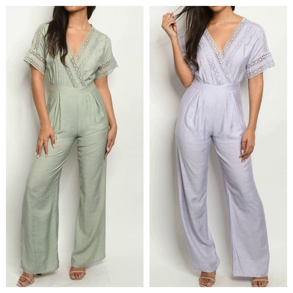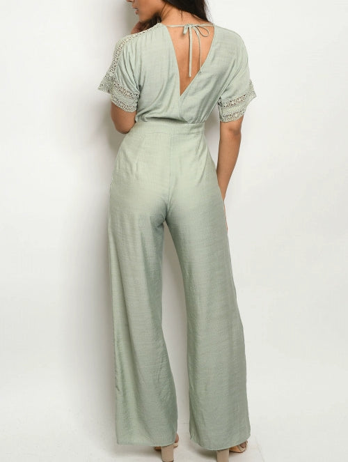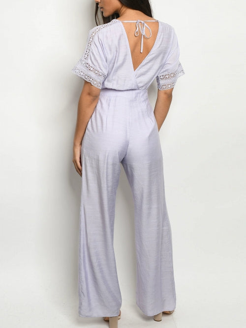 Short sleeve V-neck tie back lace trim detail wide leg jumpsuit.