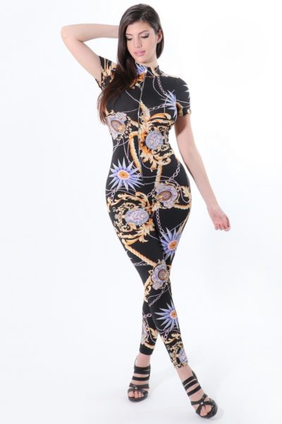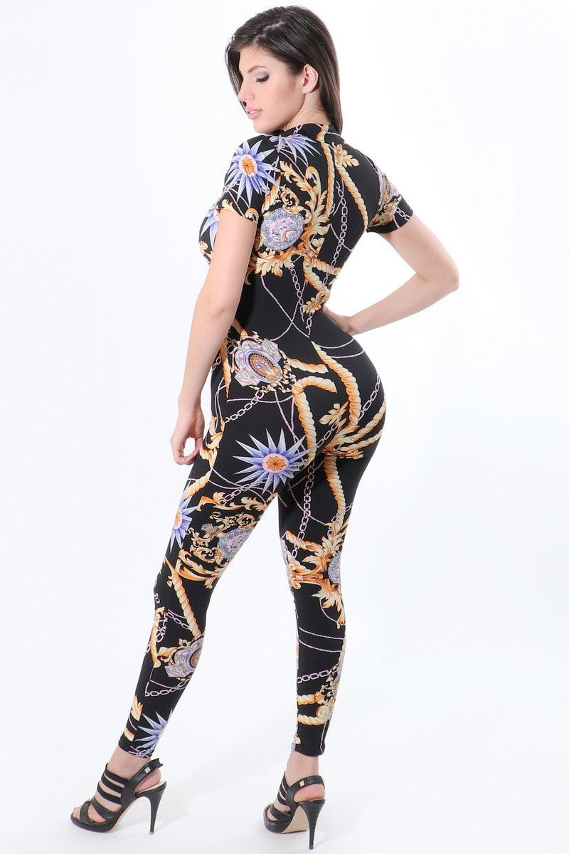 Eve. Sexy short sleeve chain print, mock neck jumpsuit, with an array of colors and front zipper closure