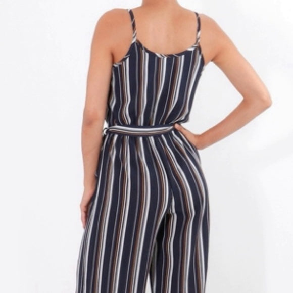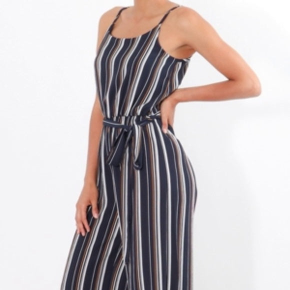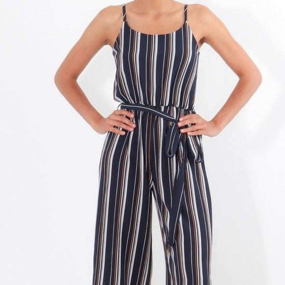 Grace is a stripe pattern culotte style jumpsuit with thin shoulder straps and a self tie belt around the waist