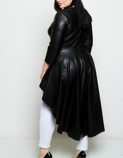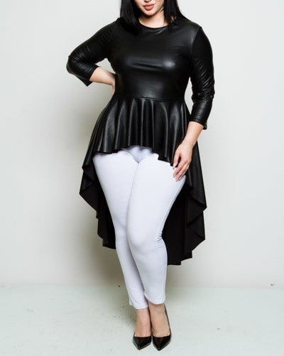 Black Faux Leather Hi / Low Peplum cascading blouse with rounded neck. 3/4th quarter length sleeves, zipper in rear of blouse.