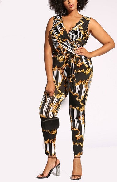 Janell is a Sexy Black and Gold jumpsuit, sleeveless with a V neckline bodice, multi print design, stretch knit fabric and self tie at the waist