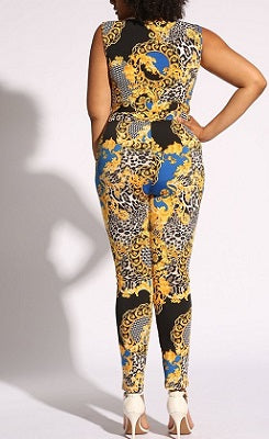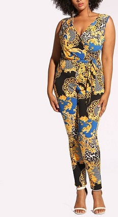 Janell is a Sexy jumpsuit with blue, black and gold multi print design. Sleeveless with a V neckline bodice, stretch knit fabric and self tie at the waist