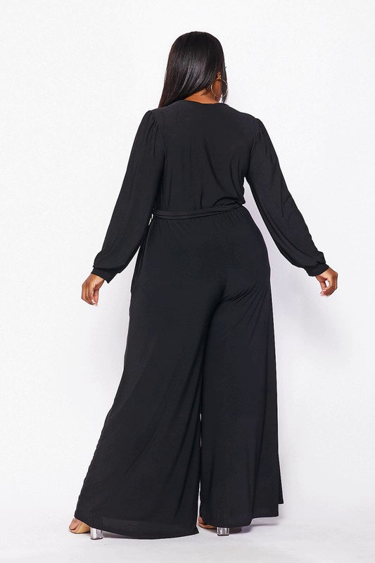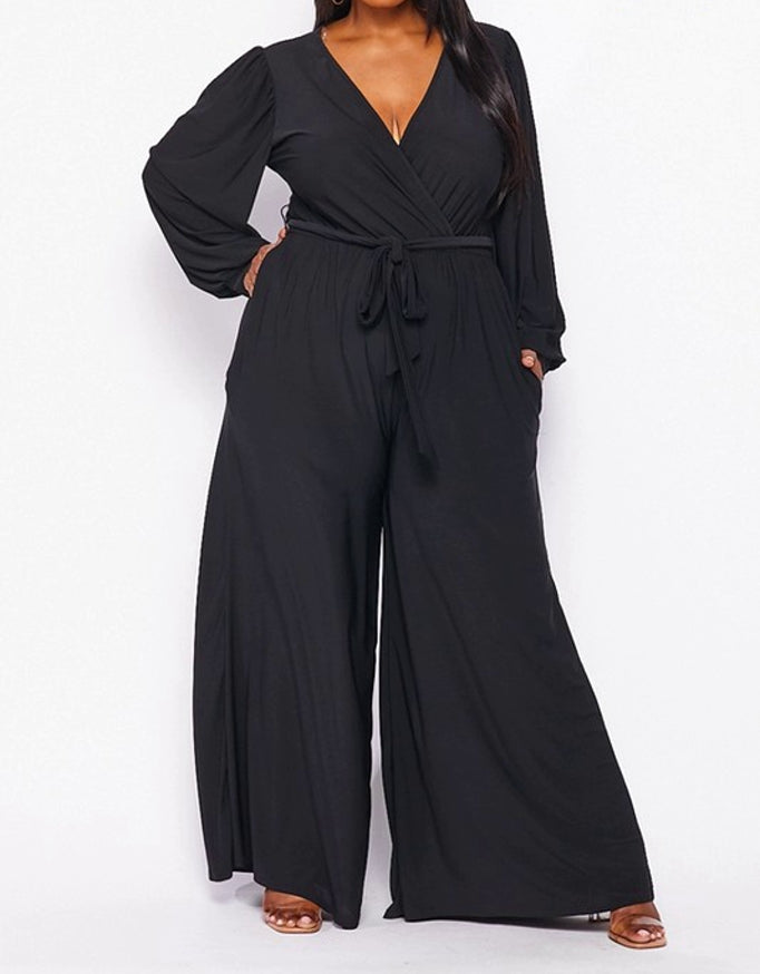 Jumpsuit has long sleeves with band at wrist, elastic at waist with self tie, cross over v-neck.