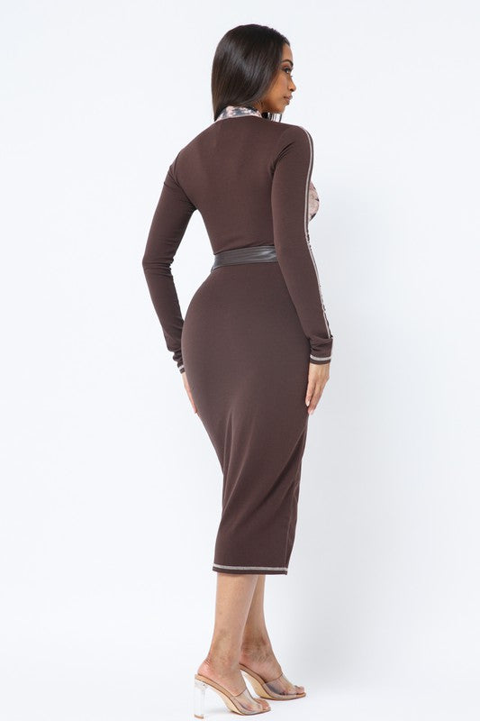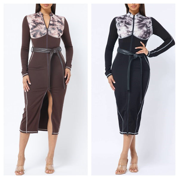 Beautiful Long Sleeve Mock Neck 2 Way Zipper with Detachable Faux Leather Belt and Marble Print Color Block Details