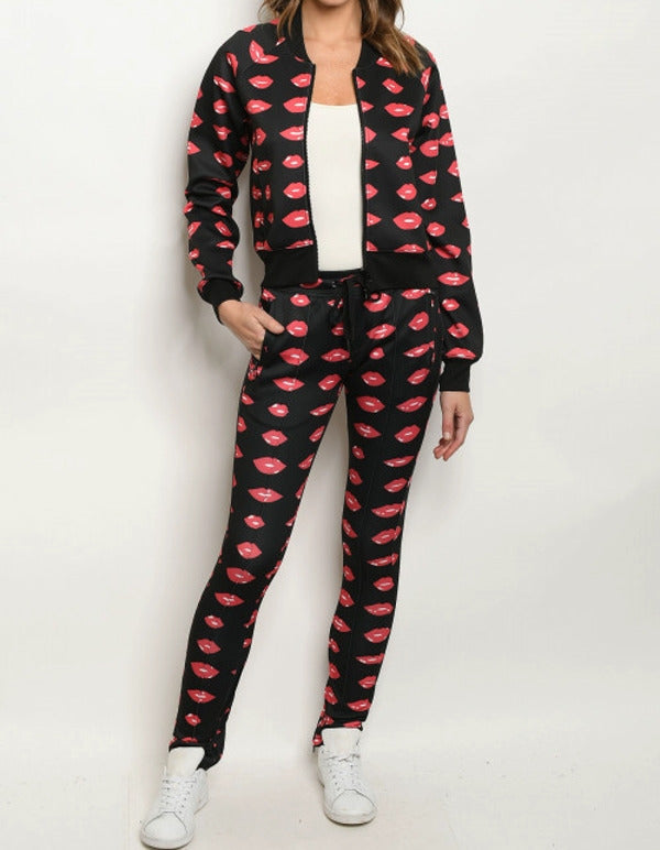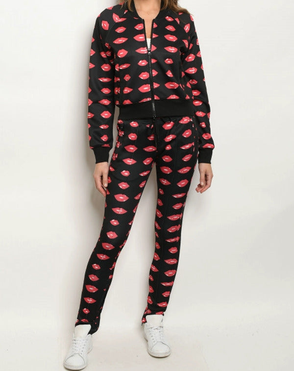 Two piece Track set. Long sleeve zip front printed jacket and leggings set.
