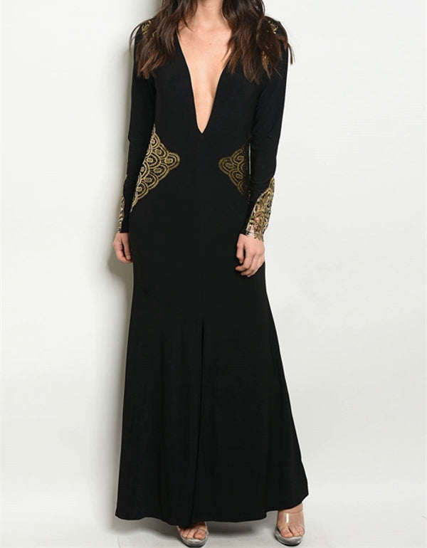 Stunning Black maxi dress with Gold Lace Embroidery at the Shoulders, waist and wrist and split in front