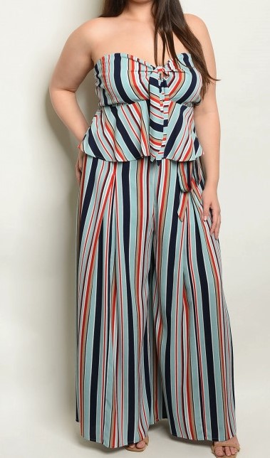 Beautiful Aqua and Navy stripe pant set. Top has tie closure. Pant has waist band and tie accent