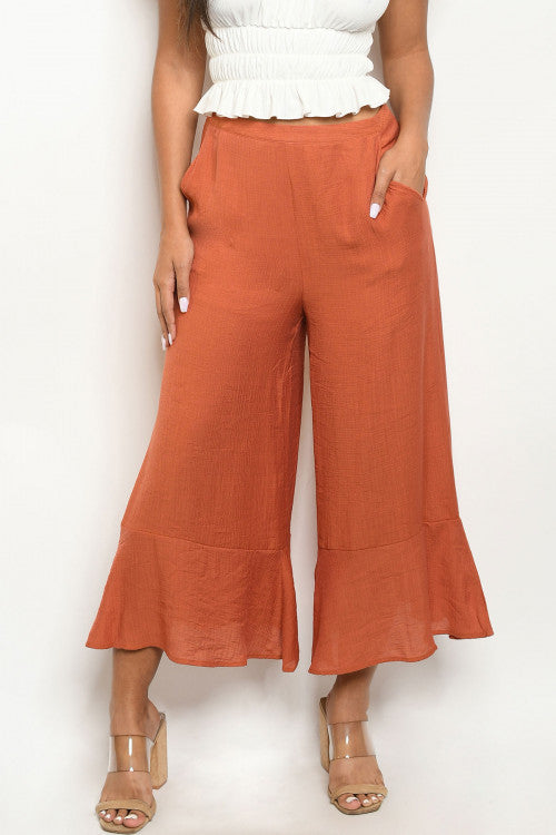 Beautiful fitted waist ruffled flare hem cropped pants in Terracotta partial lining