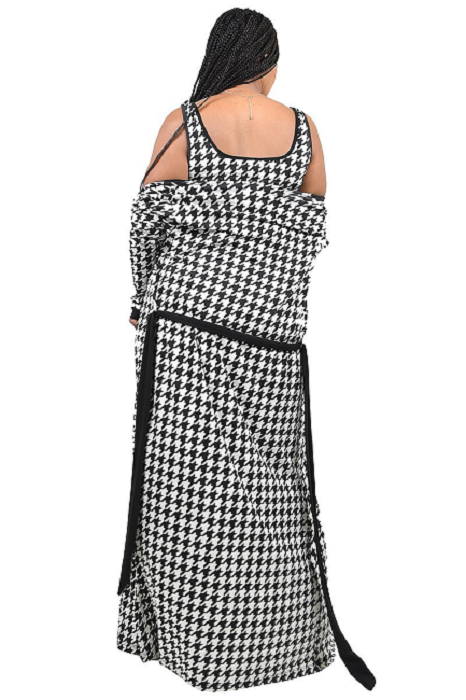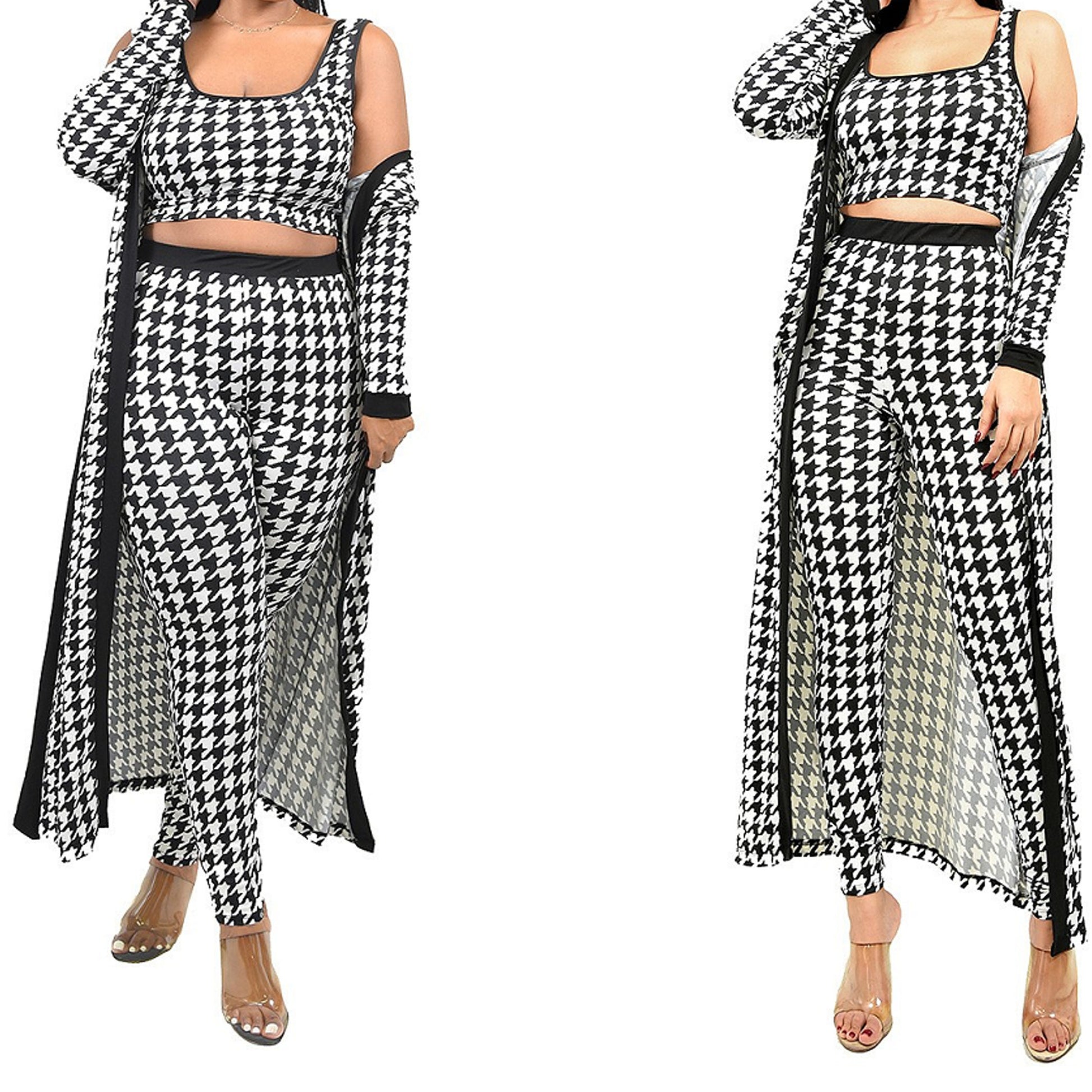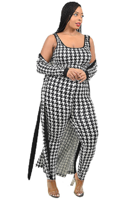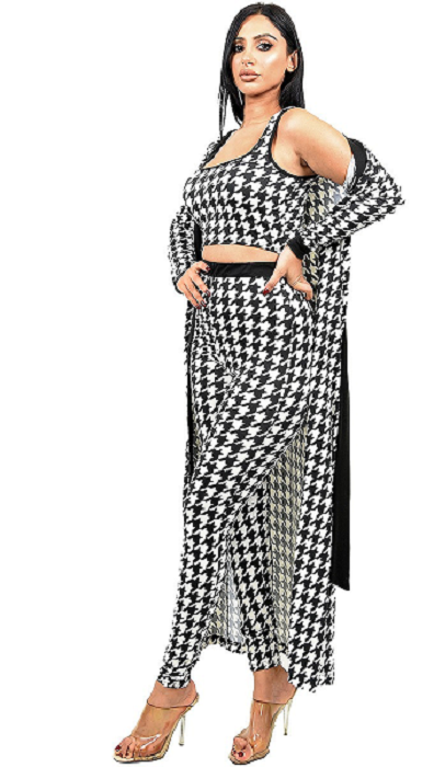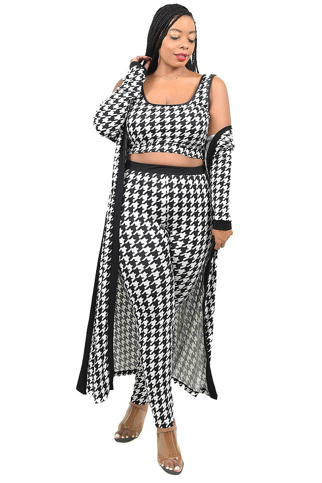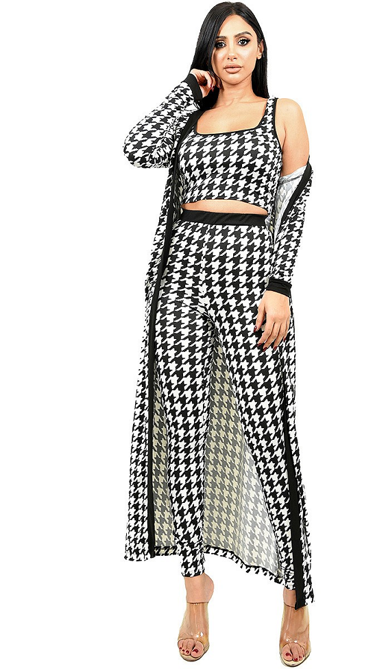 Houndstooth print 3 piece pant set . Banded elastic waist also features banded cuff at wrist. Fabric has stretch, conforming to your curves