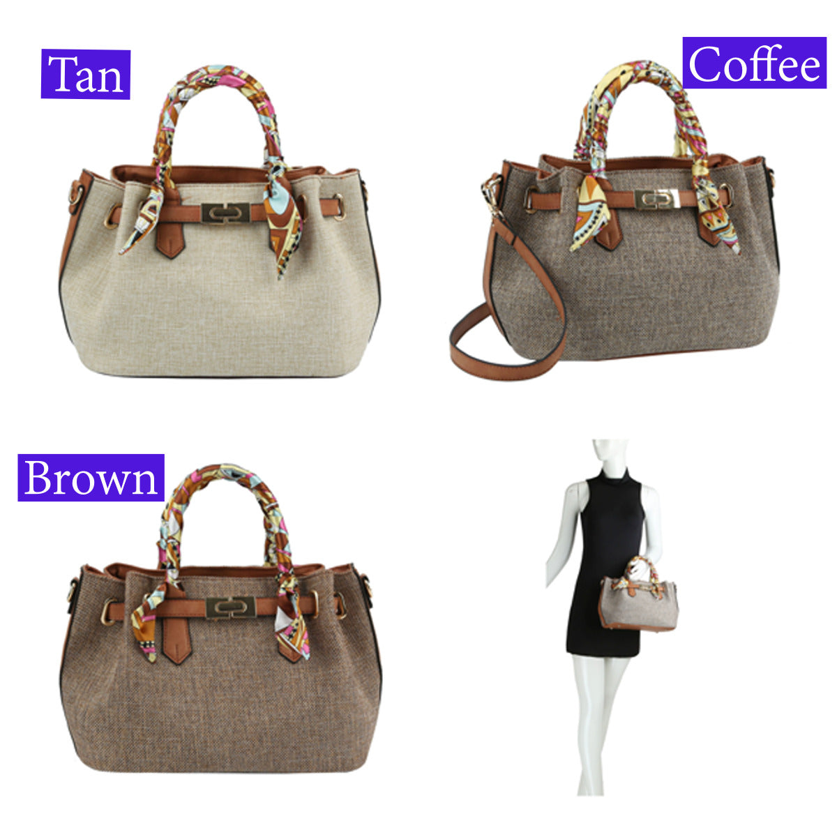 Linen with scarf Handle handbag. Faux leather trim