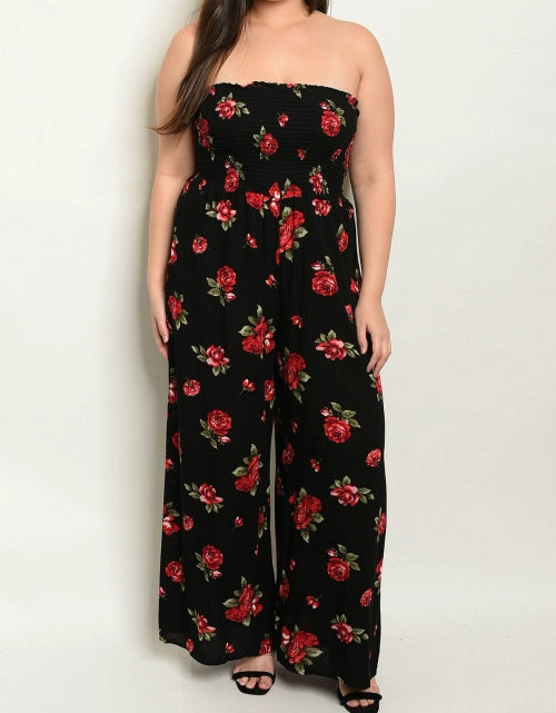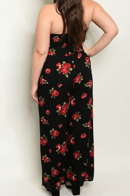 Beautiful Black jumpsuit with Red Rose print. Smocked bodice perfect for those warm days