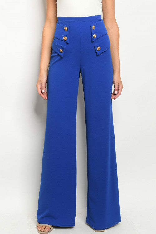 High waist button and flap detail wide leg semi-flare pants rear zipper closure