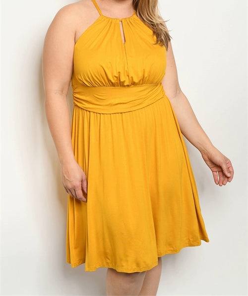 Beautiful Mustard colored sun dress featuring scoop neckline and banded waist. Tie closure in rear