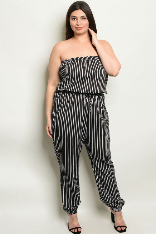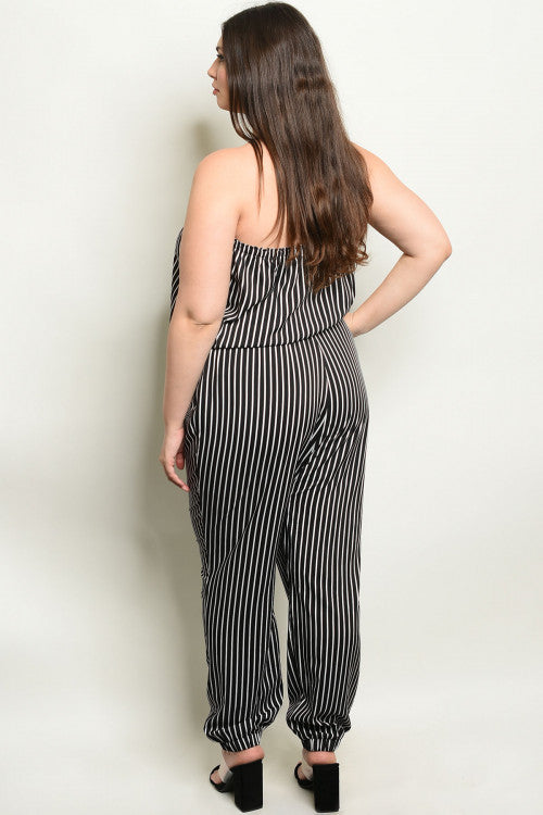 Black jumpsuit with white strips, drawstring waist, perfect addition to your vacation wardrobe