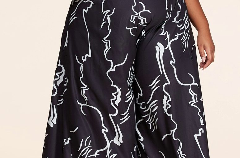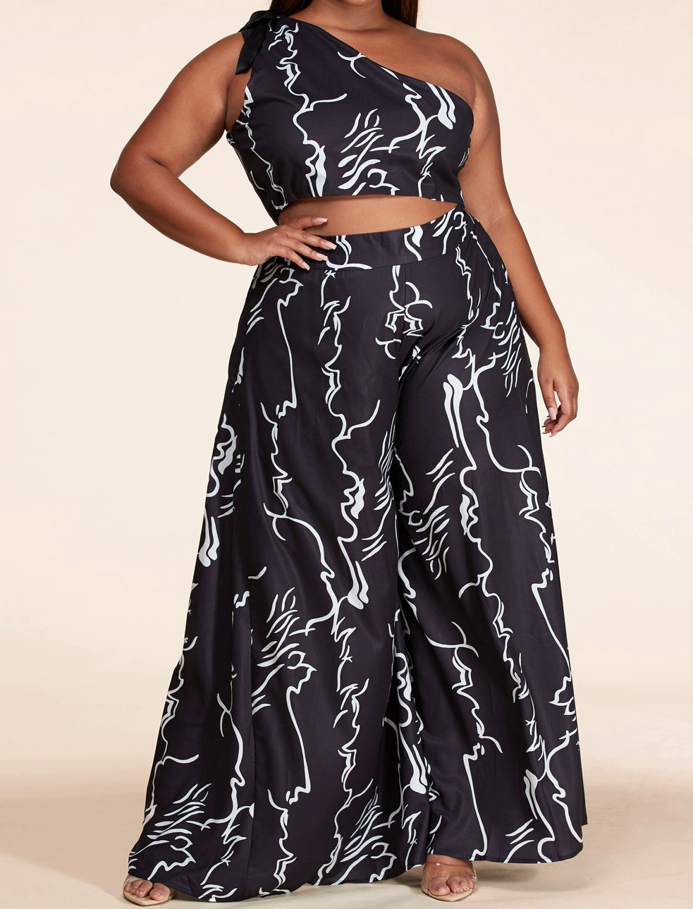 Artsy print two-piece pant set, one-shoulder crop top featuring black bow shoulder accent. Pant is high-rise, wide-leg pants.