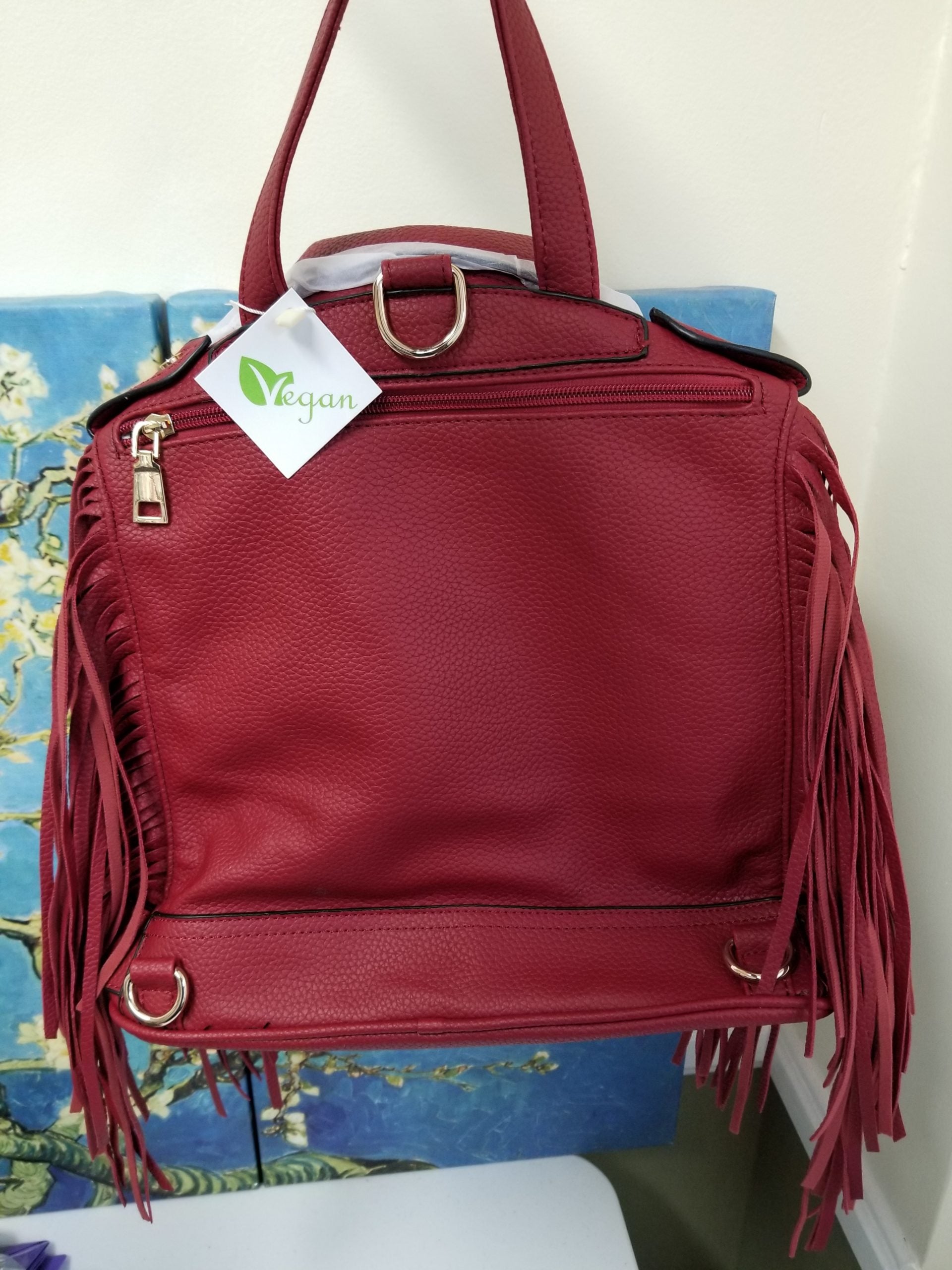 Very cute motorcycle jacket with fringe purse or backpack. Color is Black with Fringe accents and outside Pockets. Inside has one zippered pocket. Handbag has a handle or you can use one strap or use both and wear as a backpack. Bottom to the top of the purse in the center is 13.5" tall approximately 12.5" wide at the widest part. Faux leather.