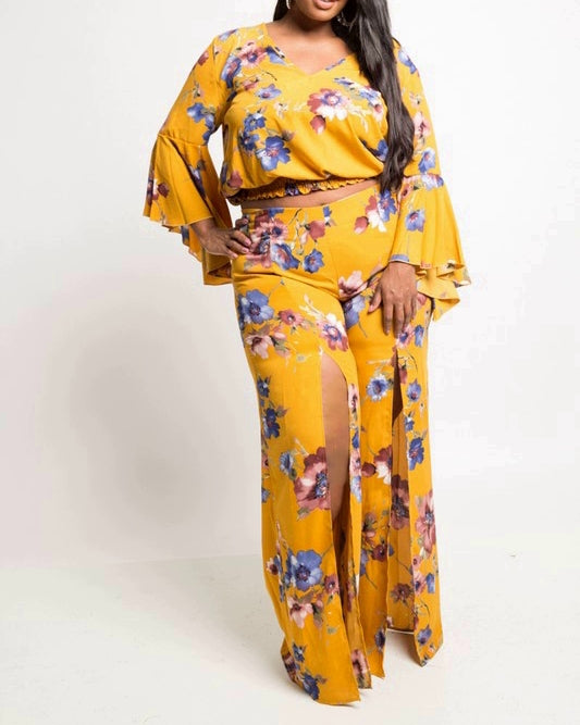 Nita is a Beautiful 2 piece pant set in Mustard. Top has V neck 3/4 length ruffled sleeves, smocked trim at the bottom. Pant features front splits and side hip zipper closure