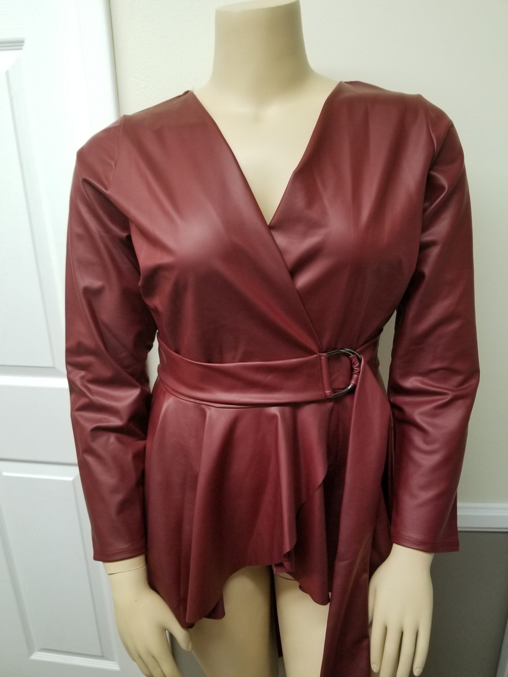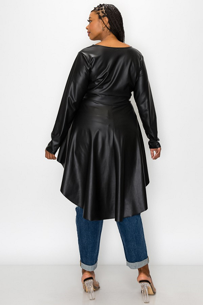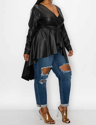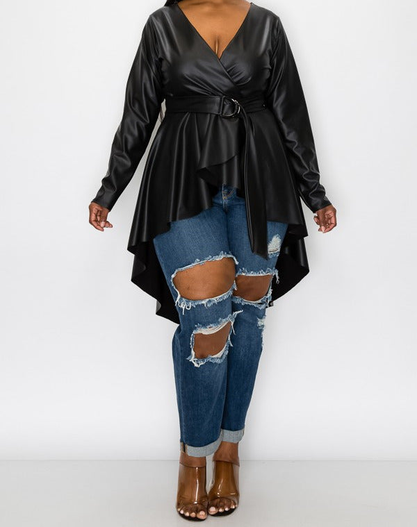 Faux Leather top or jacket featuring self close belt, peplum, high low design