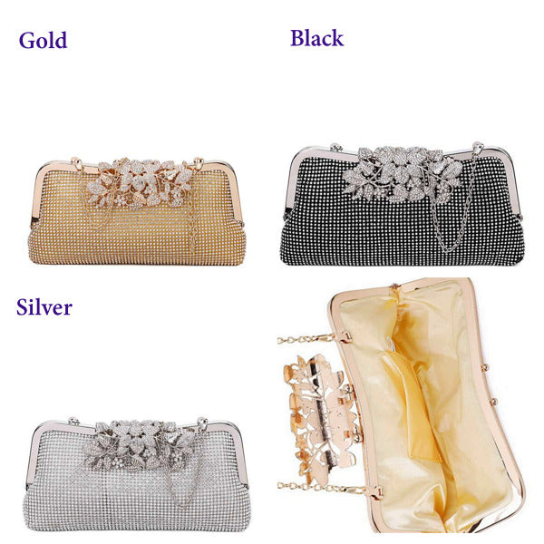 Rhinestone embedded Clutch with shoulder chain. Detachable Long Chain with Slide lock Closure.