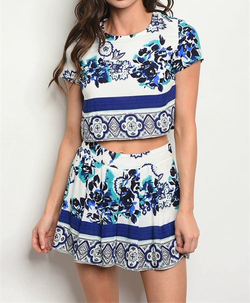 Very cute White and Navy blue floral top and short set. Top has cap sleeves and semi crop, shorts have zipper closure in rear
