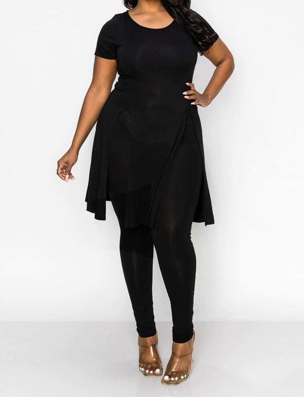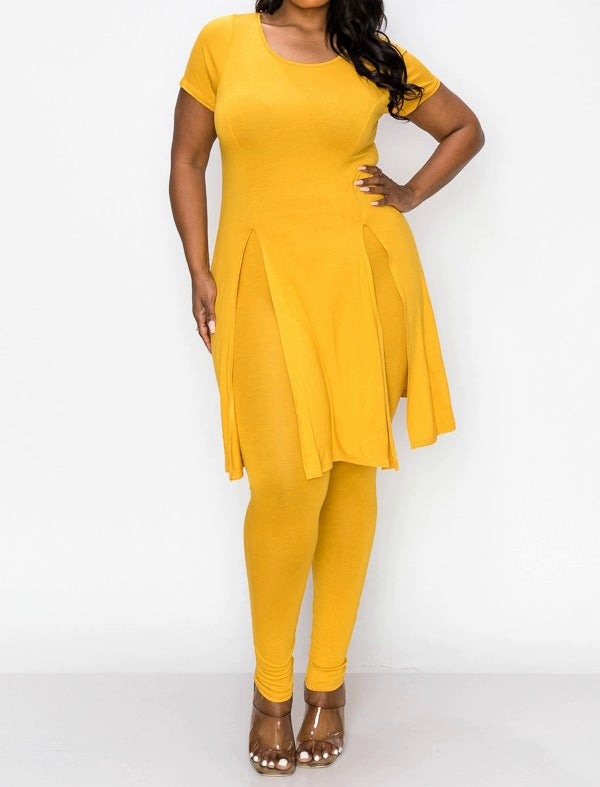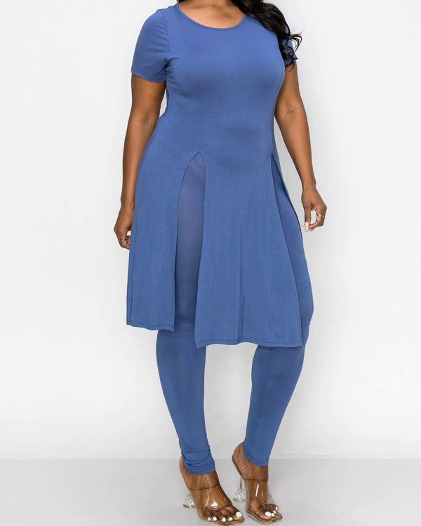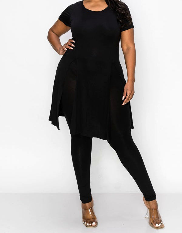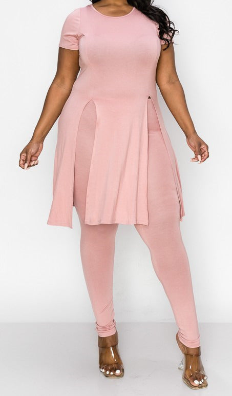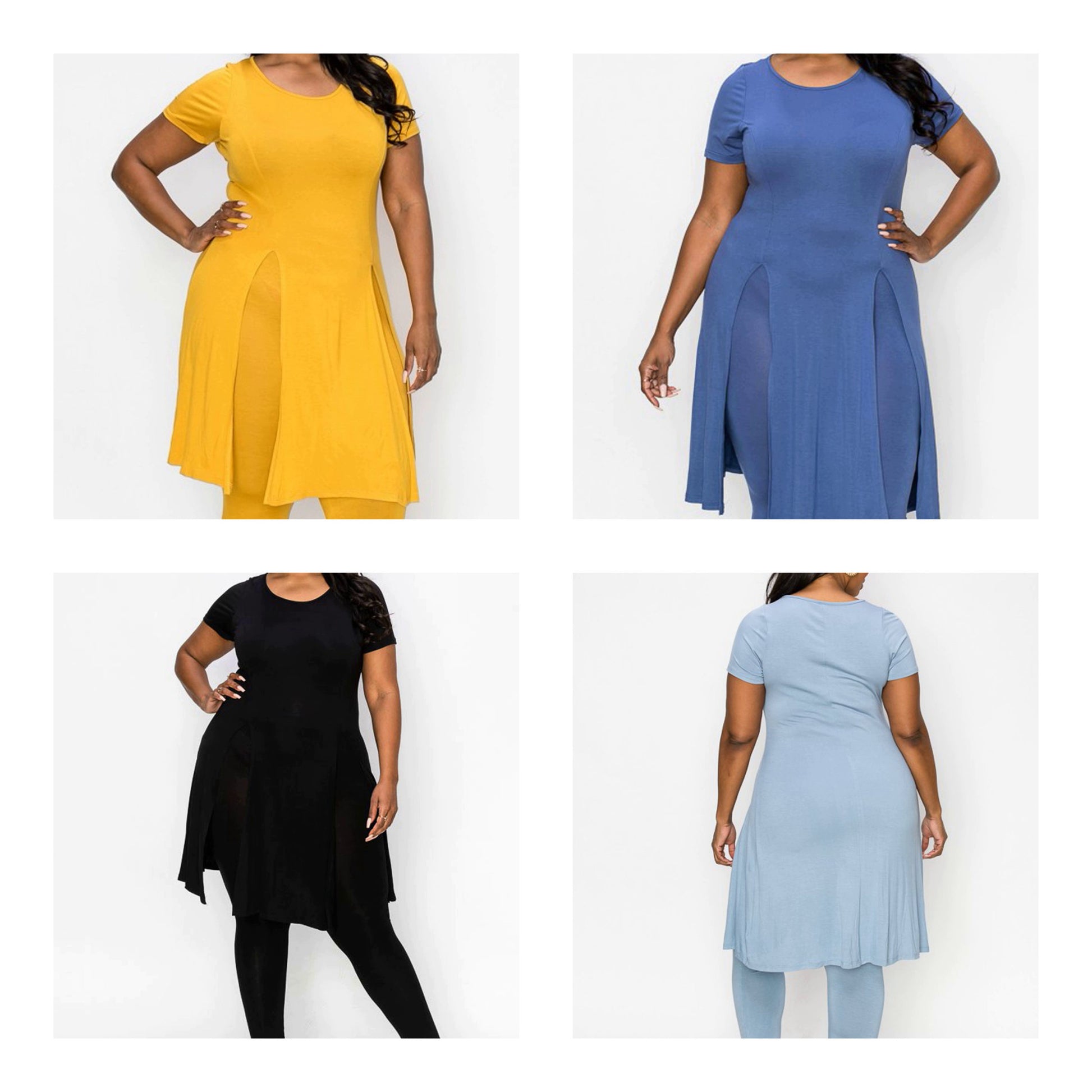 Round neck Top, slit on each side, open bottom tunic top and skinny pants sets.
