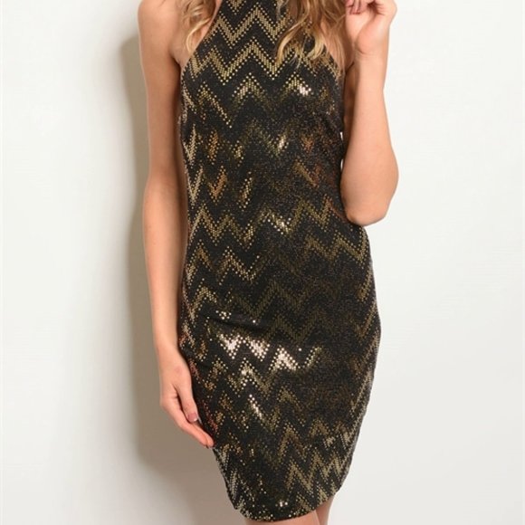 Sasha is a Beautiful Black dress with Gold chevron pattern sequins and halter neck closure with 2 buttons