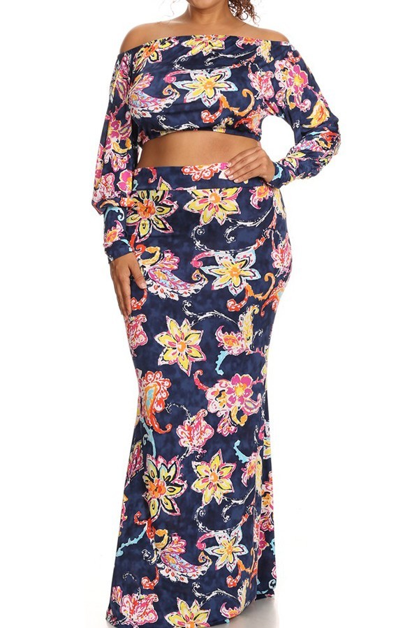 Sassy two piece Maxi skirt and blouse set with Navy Blue back ground and beautiful multi color floral. Blouse is midriff-crop that can be worn off the shoulders, has long sleeves and band at wrist