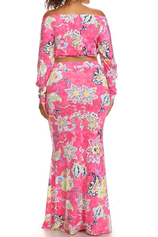 Sassy in Pink with this two piece blouse and maxi skirt set with beautiful multi color floral. Blouse has long sleeves midriff-crop that can be worn off the shoulders skirt has banded waist, fabric has stretch.