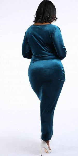 Beauty in Teal. Sati is a Velvet - Velour Maxi Dress with a slight gather on the hip and a slit