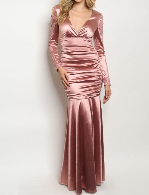 Long sleeve with lace detail on each sleeve V-plunge neckline, ruched details in front, flowing trumpet maxi gown.