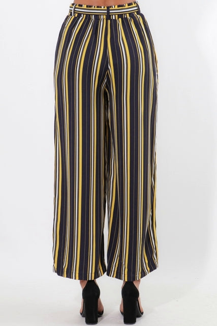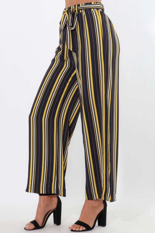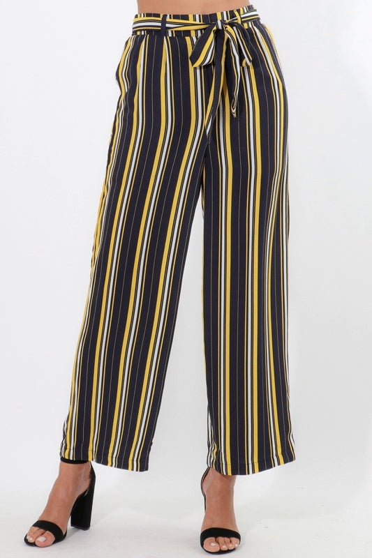 Fashionable high waist wide leg pant, with colorful stripes on a Navy blue back ground and self tie belt