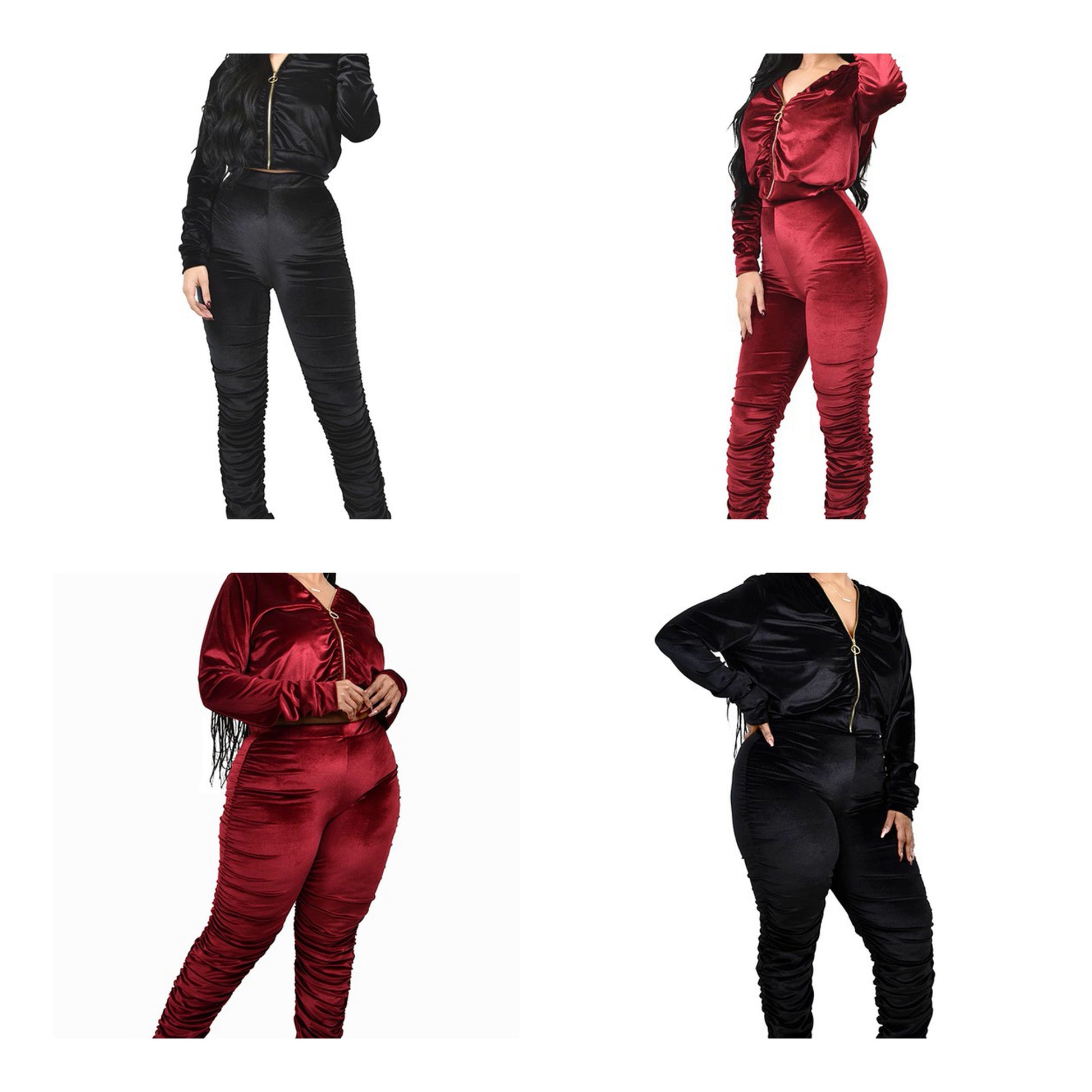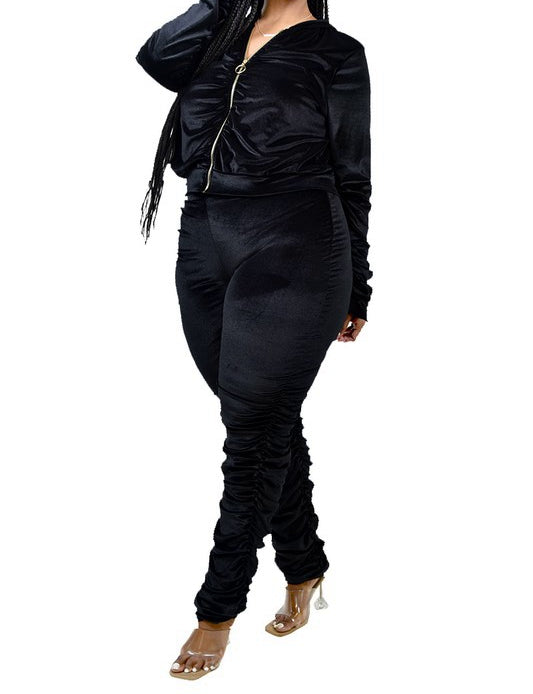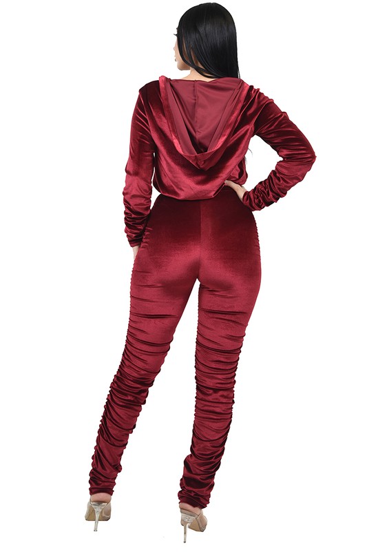 Two piece long sleeve velvet/velour hoodie track set. Featuring shirred sleeves, shirred-Gathered pants. Top is shirred-gathered in front
