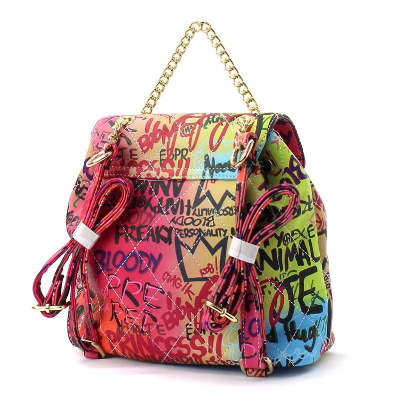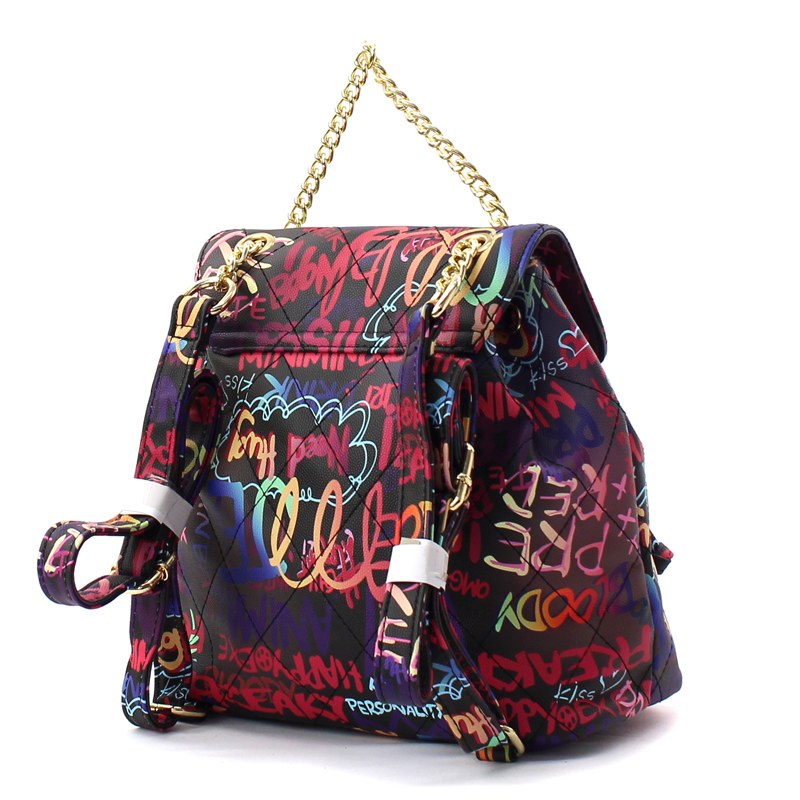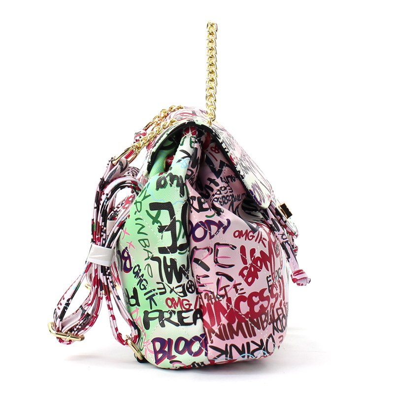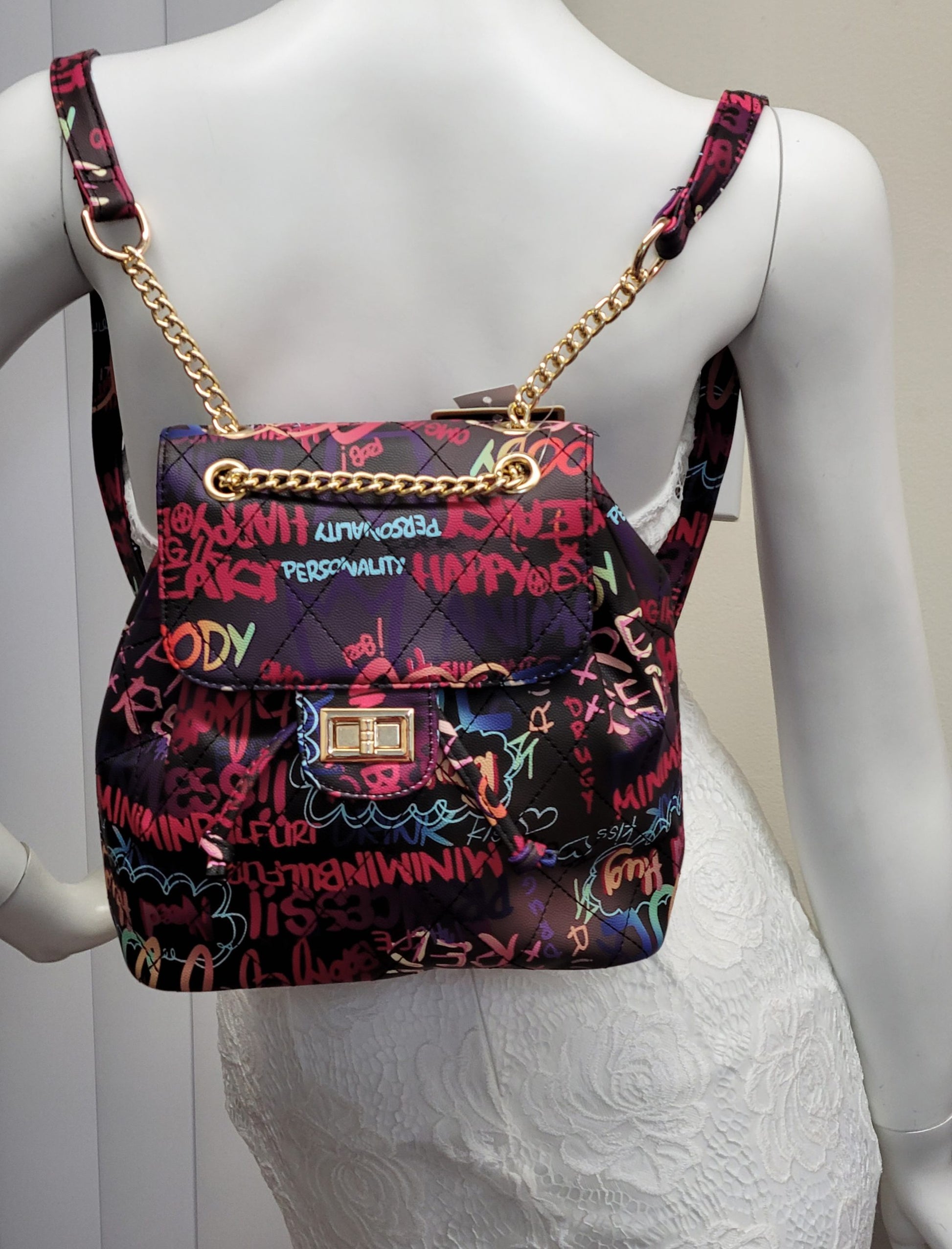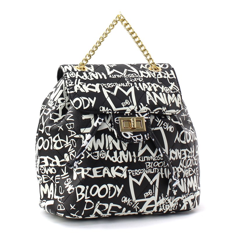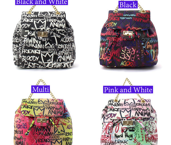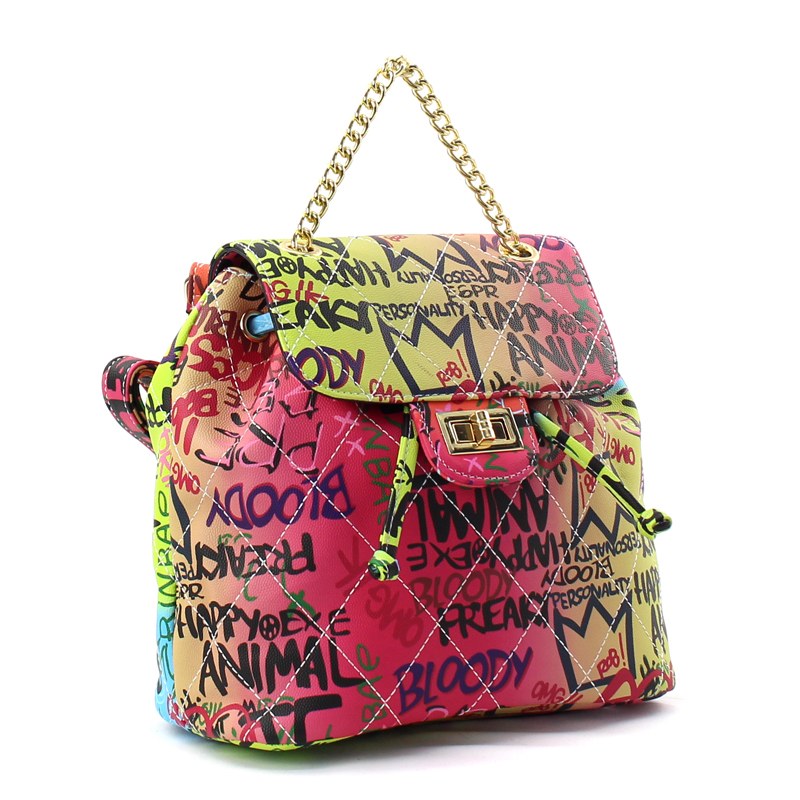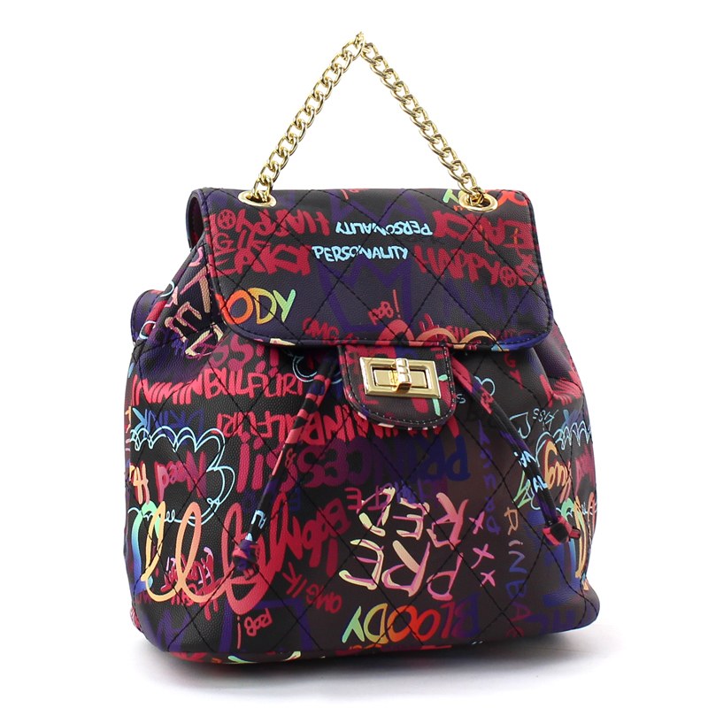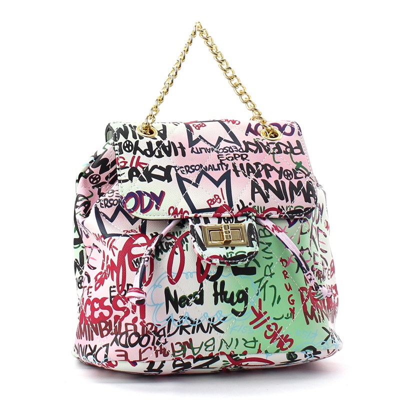 Trendy Graffiti Backpack featuring twist lock and draw string closure