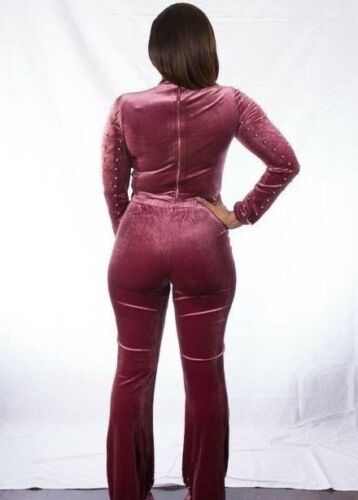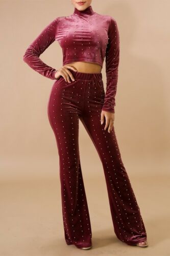 Sporty and Sexy velour two-piece set in Mauve embellished with Gold color studs on top and pant. High neck midriff /crop top. Top has zipper in rear. Pant is fitted through out the leg and flares at bottom.