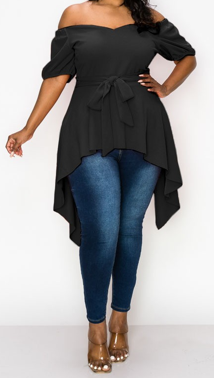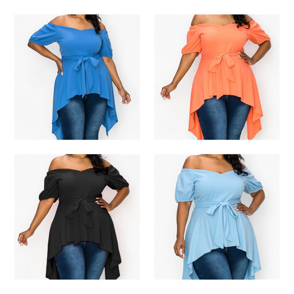 Off the shoulder, sweet heart neckline, short puff sleeves, asymmetric hem top