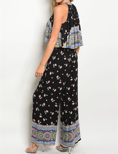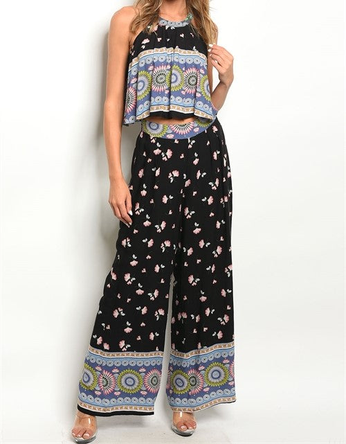 Gorgeous 2 piece medallion floral pant set with scoop neck sleeveless top, wide leg pant with zipper closure in rear