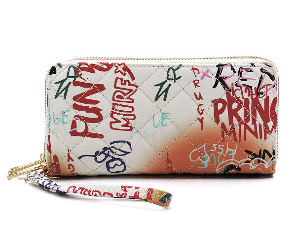 - Multi Graffiti Print Quilted Double Zip Around Wallet Wristlet