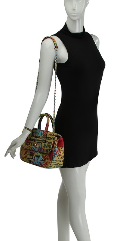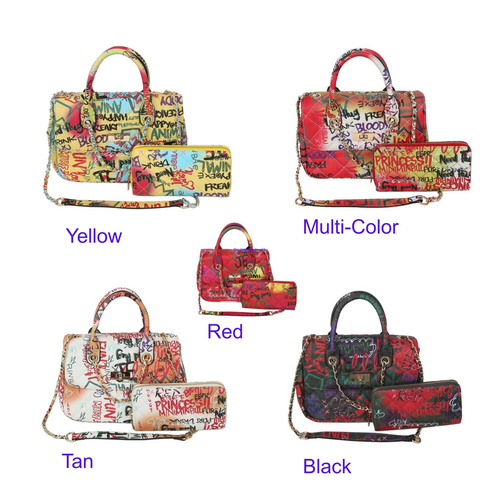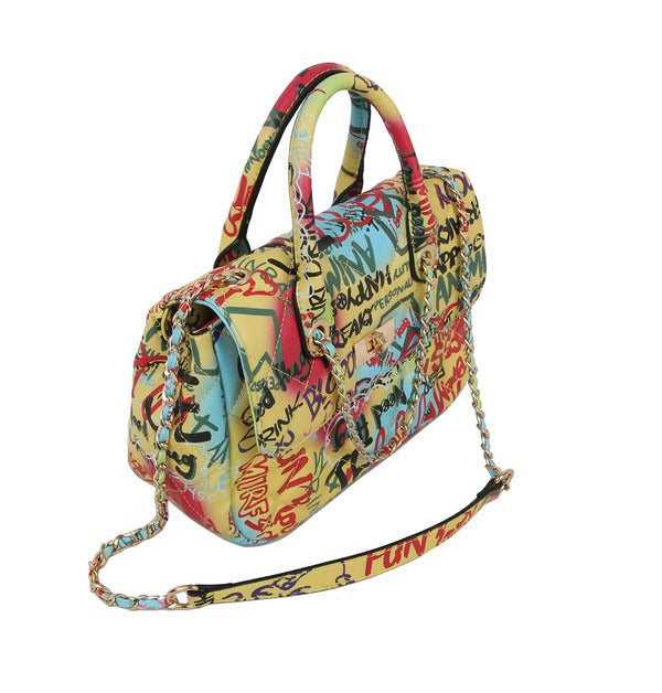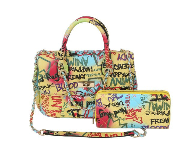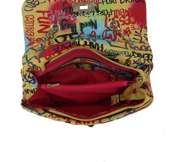 Graffiti print Medium 2 Way Quilted Turn lock Shoulder Bag or Crossbody With Wallet 2 Way chain decorated shoulder strap